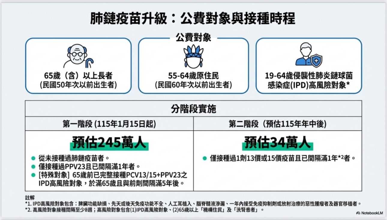 衛生福利部將於115年1月15日開始實施公費疫苗新政策,包括:成人肺炎鏈球菌疫苗(下稱肺鏈疫苗)升級、長輩流感疫苗升級及調升疫苗接種處置費,以完善對民眾健康之保障。依肺鏈疫苗成人公費對象[65歲(含)以上長者、55-64歲原住民、19-64歲侵襲性肺炎鏈球菌感染症(IPD)高風險對象等3類]之不同接種情形,分2階段開打,實施內容如下:
